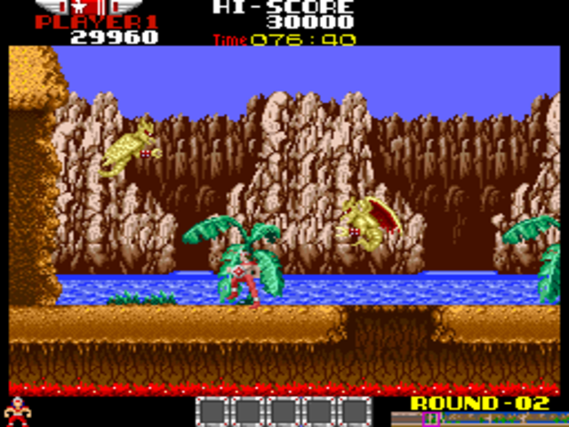 Originally released on the arcades, Rygar is a side-scrolling action game. The player controls the titular hero, advancing through stages populated by hostile creatures. Beside the Diskarmor, a weapon that looks like a shield with a chain attached to it, the hero can use a variety of other weapons, including projectiles that can be fired in four directions. Various "powers" are scattered through the levels and can be collected. The effects of these powers include increasing the fire power of the equipped weapon, adding time to the clock, temporary invisibility, extra points, etc.