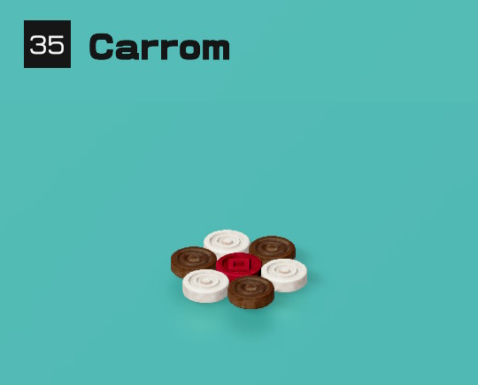 Carrom (also spelled carom/carroms) is a tabletop game of Indian origin. The game is very popular in South Asia, and is known by various names in different languages. In South Asia, many clubs and cafés hold regular tournaments. Carrom is very commonly played by families, including children, and at social functions. Carrom is not a patented game. It is in the public domain. Different standards and rules exist in different areas. It became very popular in United Kingdom and the Commonwealth realms during the early 20th century.