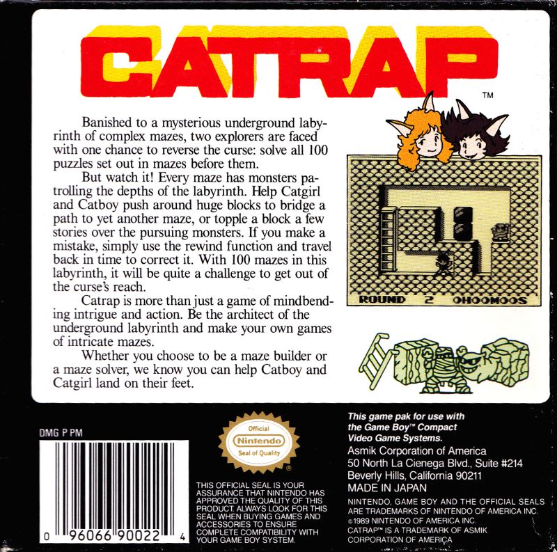 Catrap is a single screen puzzle game with 100 rounds. You and your sister (or girlfriend?) have somehow been turned into cat-humans and you're are trapped in a castle full of baddies. The gameplay is very similar to Mole Mole, and is best described as a mix between Boulder Dash and Soko-Ban.
