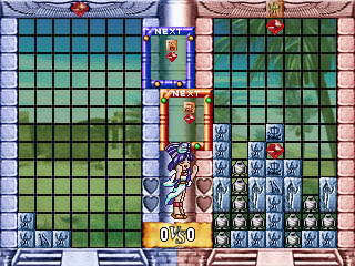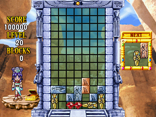Cleopatra Fortune is a falling-block puzzle game featuring a cutesy anime Egyptian theme. Groups of stones and gems of different shapes fall from the top of a well. Gems can be cleared by enclosing them within a group of stones, and stones can be cleared by making complete rows from them. Blocks will fall when those under them are cleared, which can create chains for more points.