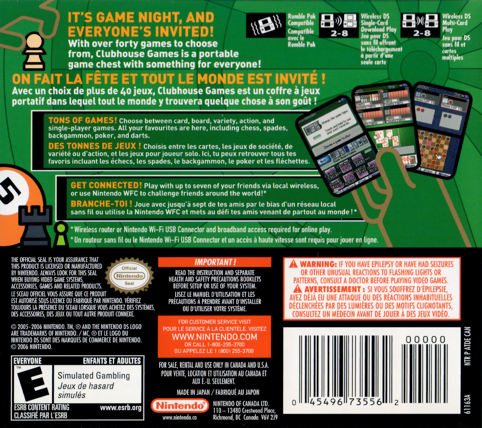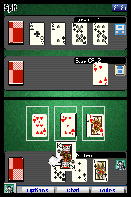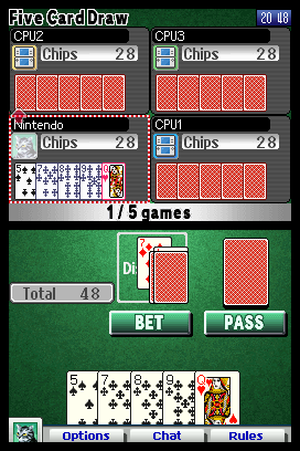 This game presents 42 (mostly) well-known games including 18 card games, 12 board games, 4 "variety" games, 5 "action" games and 3 single-player games; although a few of the games must be unlocked before being played. Each game has options that can be used to create further gaming possibilities. All the games are played with the DS touch-screen.