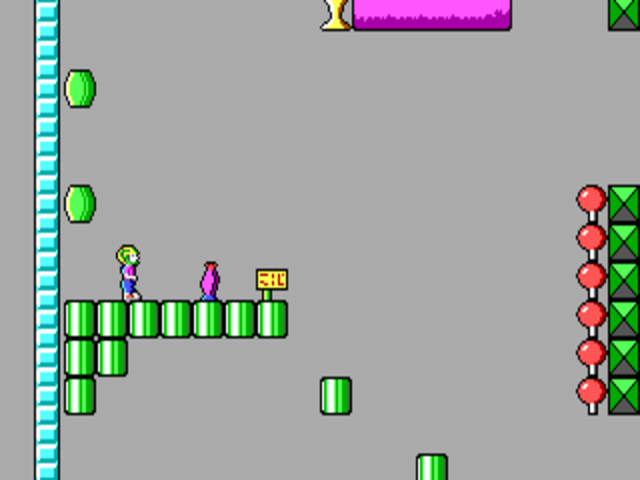 Thankfully, Keen can defeat some of the enemies with his raygun. He can also find a pogo stick which allows him to jump very high. Other items to find include keycards that open locked doors and bonus items which give score (Keen gets an extra life if he collects enough score).