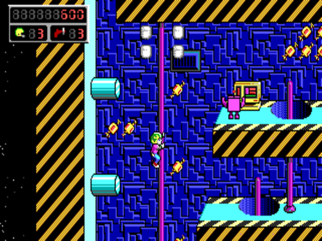 Thankfully, Keen can stun most enemies with his raygun, although some cannot be stunned at all, and some are only stunned for a few seconds. Keen also carries a pogo stick which allows him to jump very high. Other items to find include: ammo, gems that acts as keys to open locked doors, bonus items which give score, raindrops (100 raindrops give extra life) and the rare Lifewater Flask which gives an extra life.