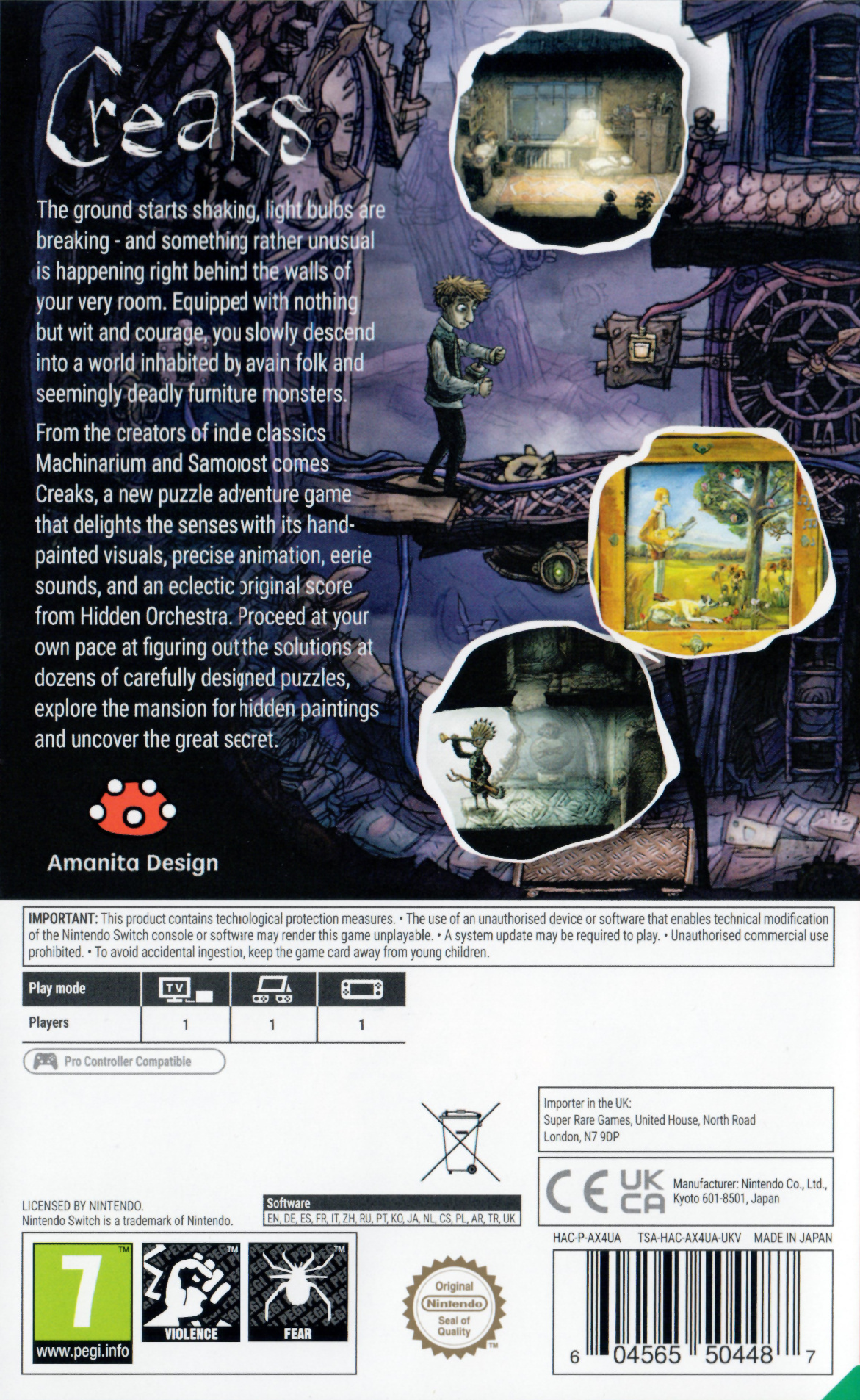 From the creators of indie classics Machinarium and Samorost comes Creaks, a new puzzle adventure game that delights the senses with its hand-painted visuals, precise animation, eerie sounds, and an eclectic original score from Hidden Orchestra. Proceed at your own pace at figuring out the solutions to dozens of carefully designed puzzles, explore the mansion for hidden paintings, and uncover the great secret.