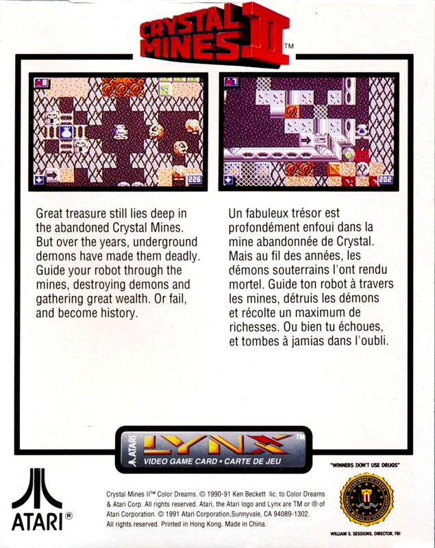 In Crystal Mines II, you operate a robot going through the abandoned crystal mines, picking up crystals and avoiding the underground demons that inhabit the mine. Mine levels are completed when a crystal quota is reached, however the quota is usually not the entire level so bonus points can be obtained by finding additional crystals. Like Boulder Dash, gravity is a factor and affects any boulders, crystals, etc. so they can be used as weapons against demons. There are also deceptive elements, such as "Dormant" demons that look like boulders, that add to the challenge. Finally, the robot has weapons that can be used to eliminate certain obstacles.