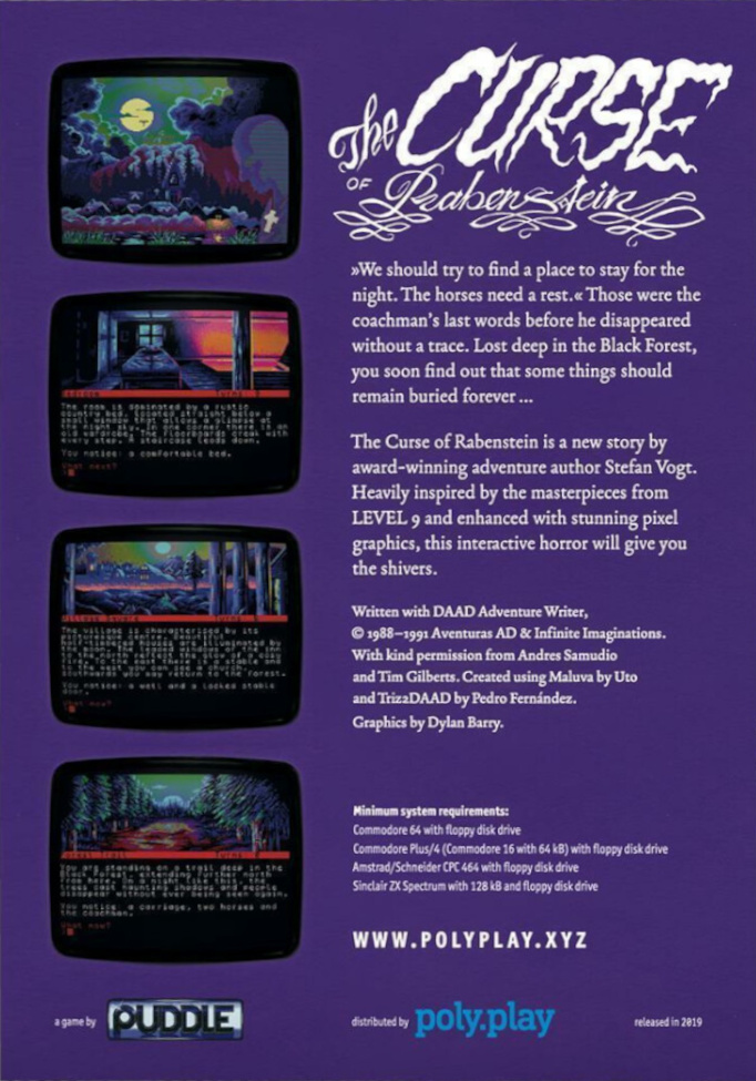 Rabenstein is available for C64, Plus/4, CPC, ZX Spectrum (48k and 128k with divMMC), ZX Spectrum +3, ZX Spectrum Next, Amiga, Atari ST, MSX1, MSX2, DOS and modern PC.