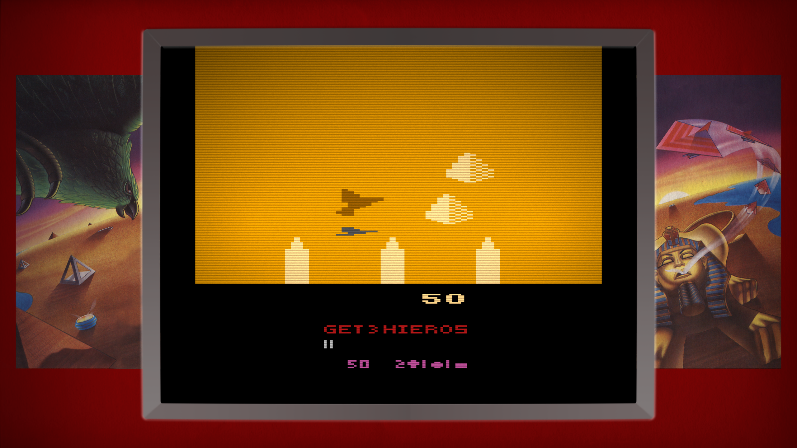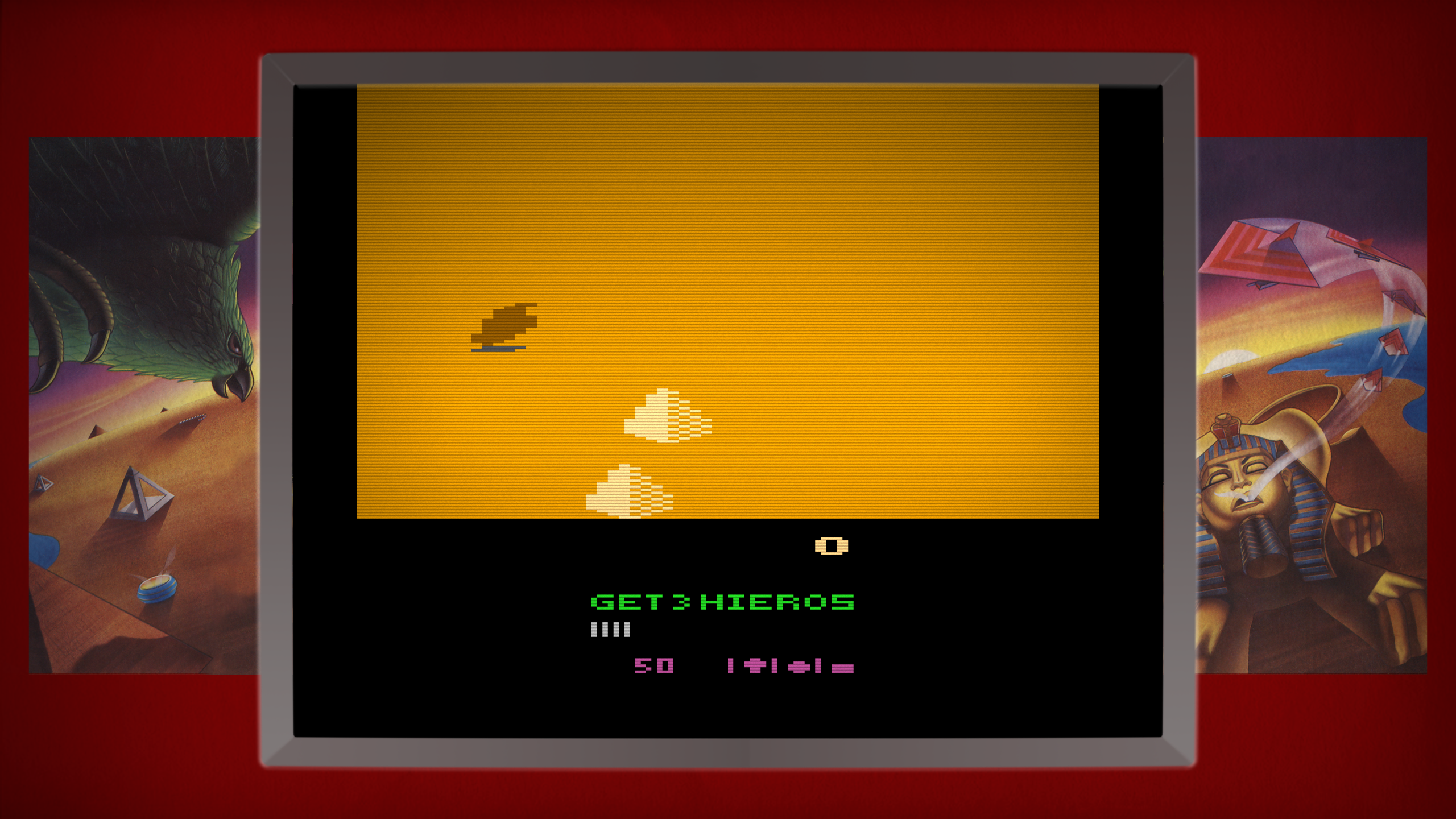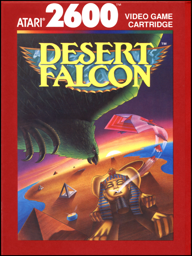 This arcade-style flight shooter pits would-be treasure hunters against thematically ancient Egyptian guardians such as vultures and scarabs. While it cannot compare visually to the 7800 version, Desert Falcon 2600 still delivers the core gameplay. Keep an eye on your bird's shadow to gauge your height!