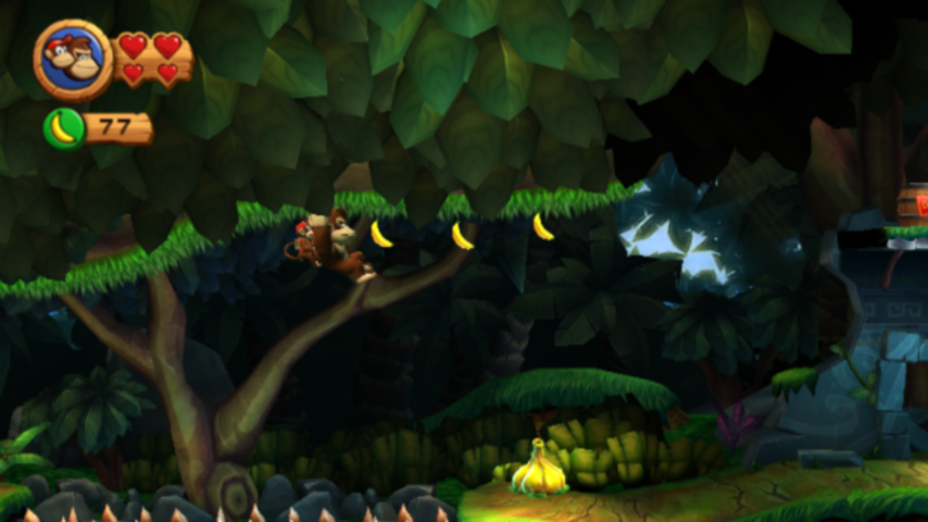 The Wii also allows motion control elements. Moving the remote and nunchuk up and down rapidly, for example, makes Donkey Kong slap the ground, revealing hidden items or breaking apart rocks and land beneath him. Other little tricks with motion control allows DK to roll quickly across the landscape or create a gust of wind to reveal even more secrets.