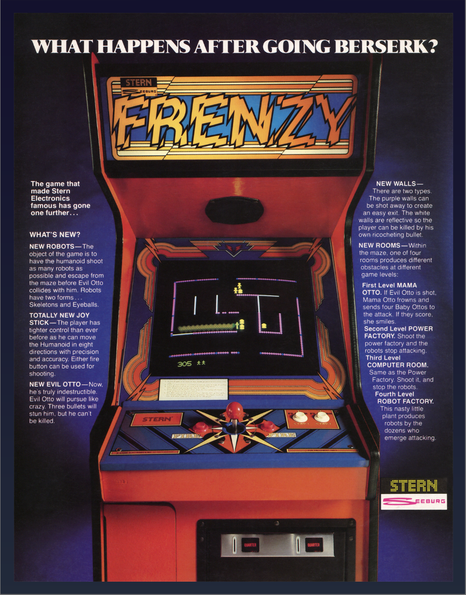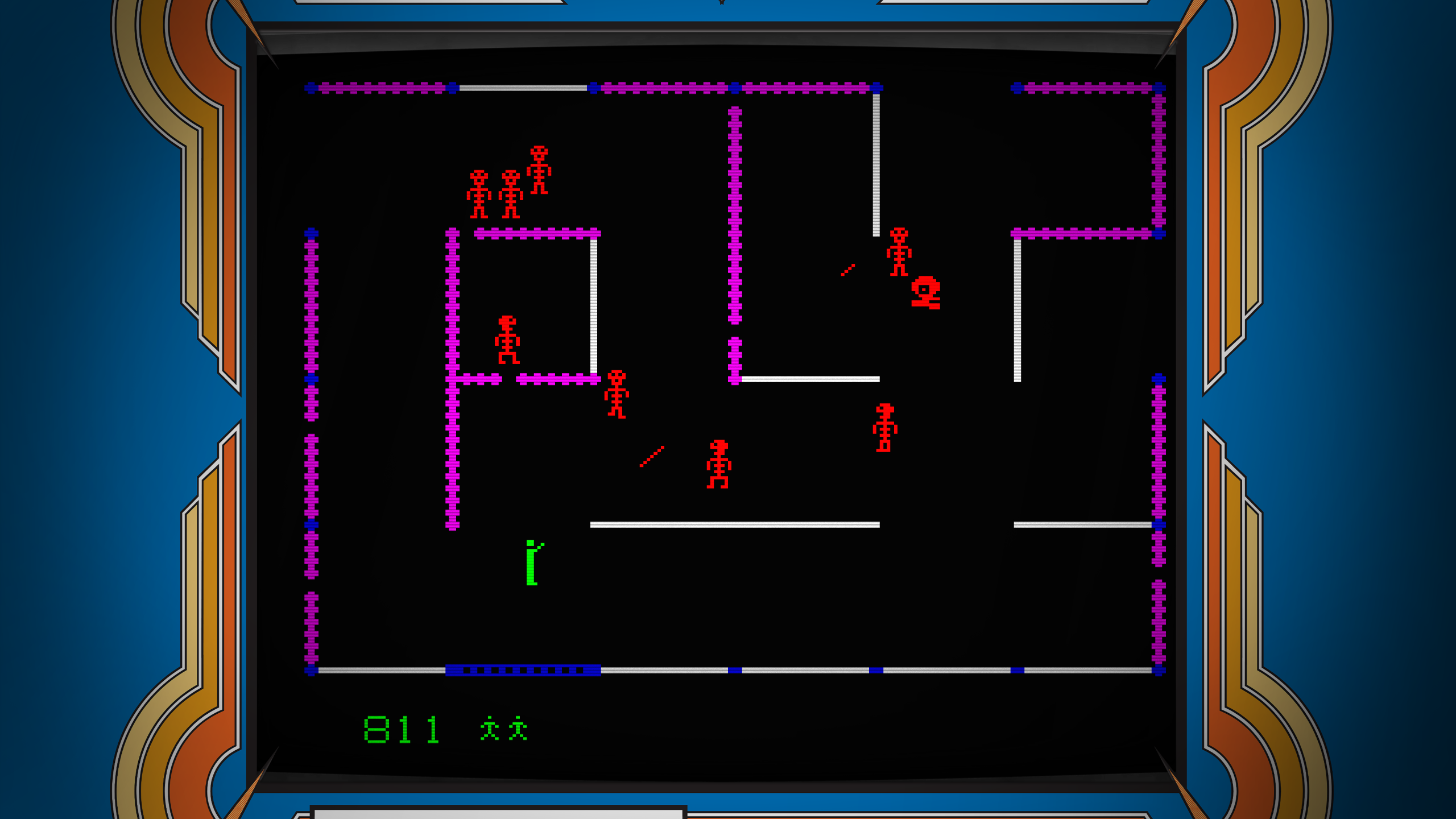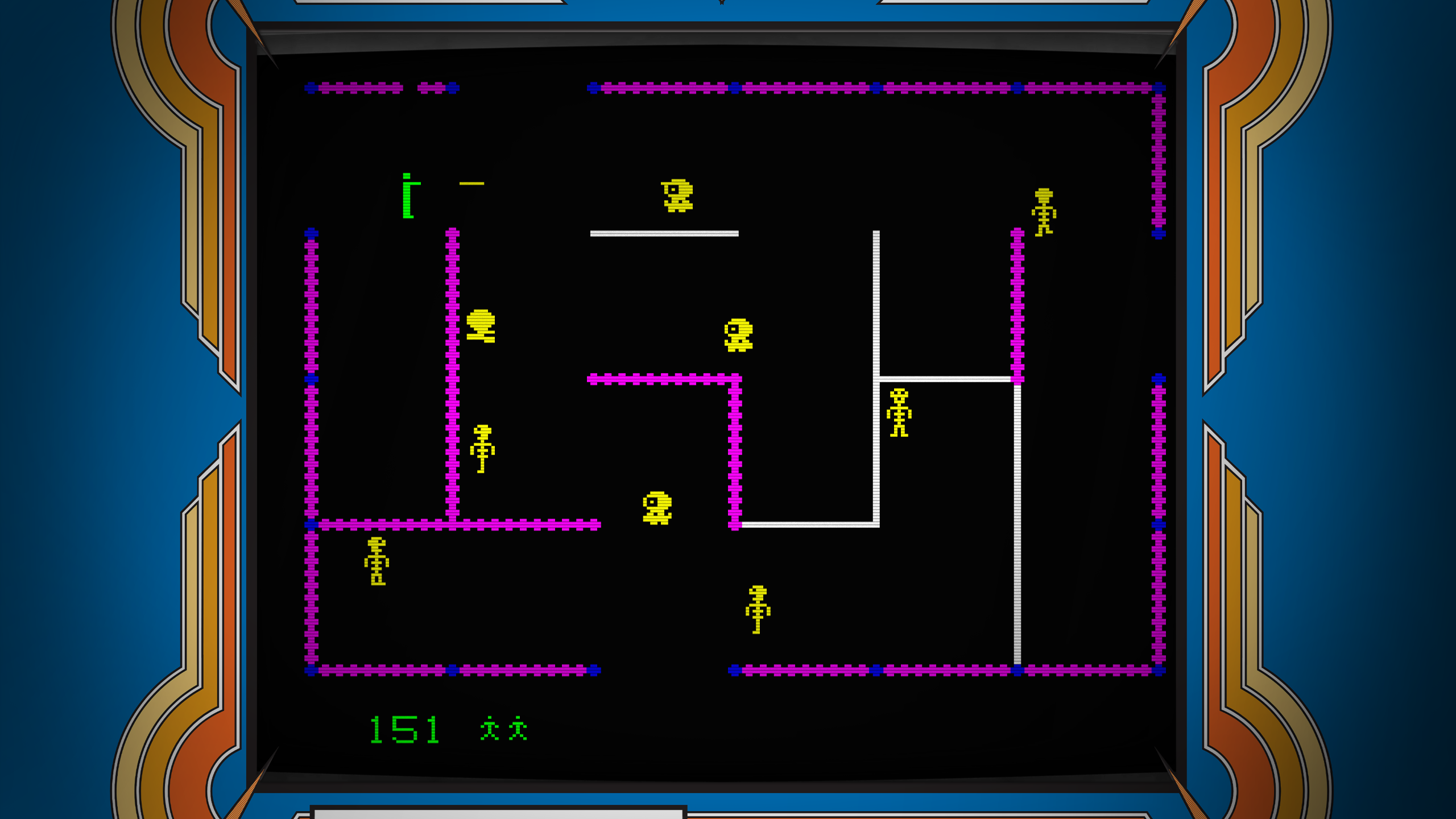 The sequel to Berzerk offers more panic and paranoia, as human players struggle fo survive in a never-ending labyrinth of deadly robots and claustrophobic walls. To innovate for the sequel, some of those walls reflect the player's shots, while others can be partially destroyed, creating new escape routes.