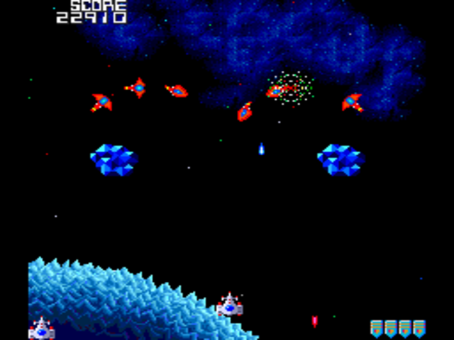 Later in the game some enemies are equipped with armor that renders them invincible while in formation. When one of these enemies starts its dive, it will flip over and expose its vulnerable side, then flip over again and become invincible while it moves back up the screen, then flip one more time and finish its dive. While vulnerable, this enemy can be destroyed in one hit, scoring bonus points. In addition, many different kinds of obstacles appear throughout the game, including blue crystals, boulders and green blobs.