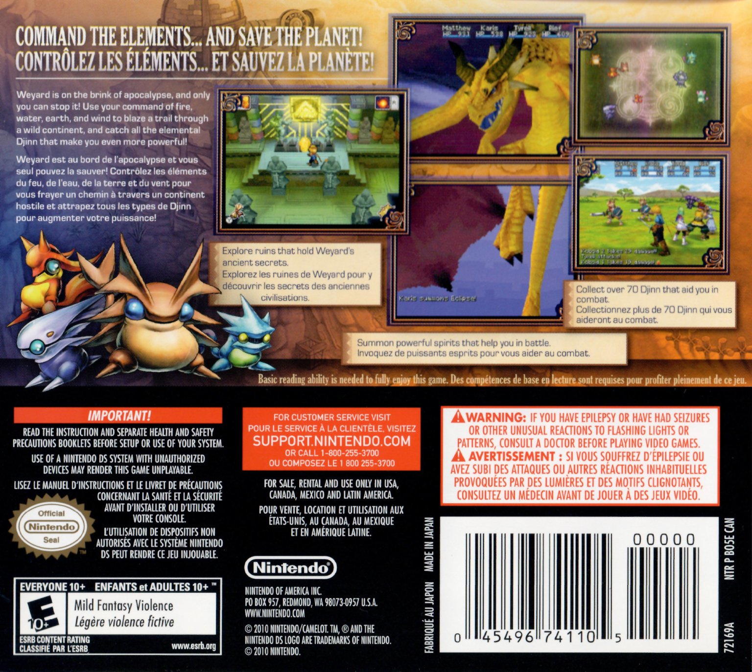 The gameplay is very similar to previous Golden Sun games. In this role-playing game, four different types of elements (fire, water, wind and earth) are combined to create spells. Combat often involves facing multiple monsters at each time.