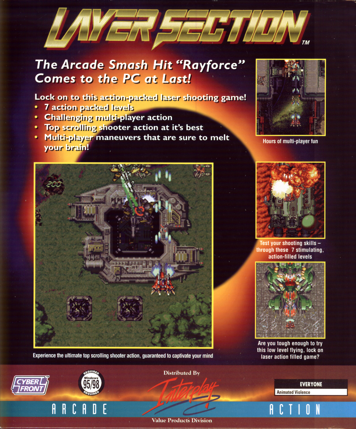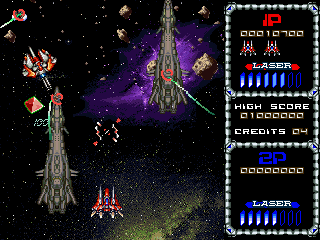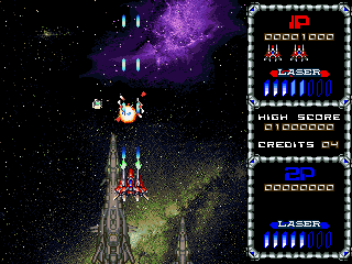 Layer Section/Rayforce/Galactic Attack is a top-down shooter, there are seven levels to play, ranging from battles in the atmosphere of planets to battling over mountain ranges, each with their own standard huge bosses at the end of each of these levels. The player takes control of a starfighter called the RVA-818 X-LAY, out to destroy any opposing forces.
