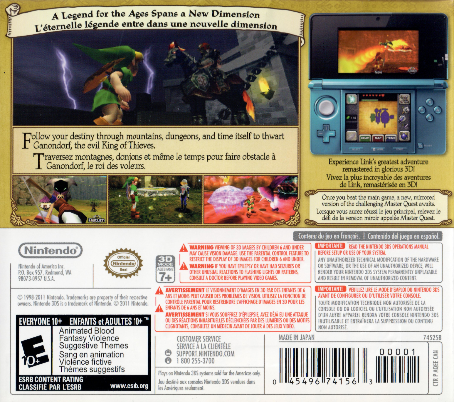 The Legend of Zelda: Ocarina of Time 3D is a graphically enhanced remake of the Nintendo 64 version. The game has undergone some major changes. The graphics update and the addition of 3D-effects is the biggest one. The touchscreen is now used to replace the old menu which required the player to push the start button, now the player can simply select an item by touching it on the screen. There is also the gyroscopic technology which allows the player to aim by moving the system, this makes it easier to use weapons like boomerangs and slingshots. The game also contains the Master Quest version and a new "boss challenge" mode. For the newcomers there is also a feature called "visions" that show the player how to complete certain tasks.