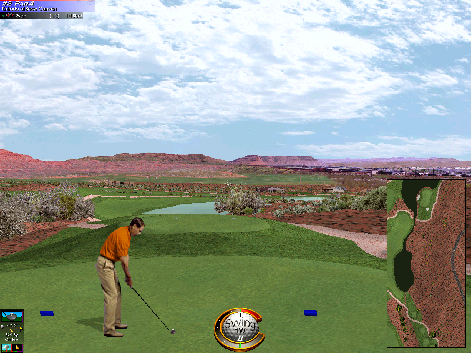 Improved graphics are seen here, including 3D objects, better panorama, and more realistic ball-flight physics. Smart Cameras allow you to see the course from any point of view. Additional bits of eye-candy include haze, fog, waving flags, airplanes, etc. Links LS 1999 also includes carefully digitized footage of Arnold Palmer for realistic animations.