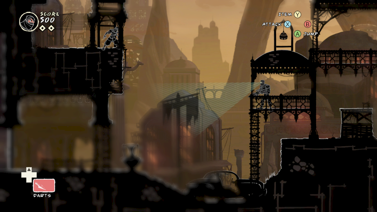 The game features a similar art style to Klei's prior Shank games. The environments feature sources of light that will reveal the player to any guards nearby. Additionally, many of the players actions (like running, breaking objects, etc.) will create noise the guards will hear and respond to. By approaching enemies undetected, the player character is able to execute a one-hit kill. It's also possible to complete the entire game without killing any enemies, with the exception of two named NPC "boss" characters.