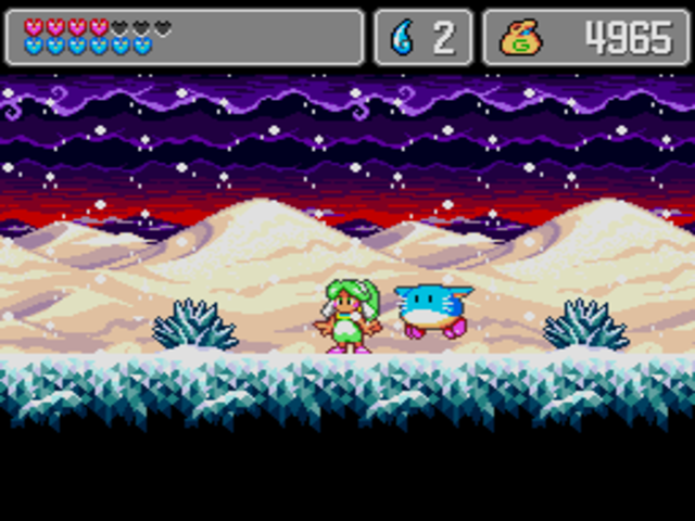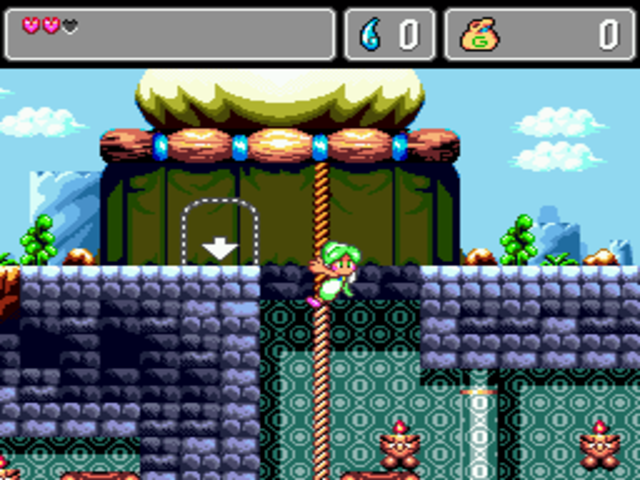 The game is a side-scrolling action platformer with light RPG elements (treasure, equipment, etc.). Asha can jump, run, attack or defend (by pressing the "down" button). She can also use items and equip weapons and armor, talk to people, and open treasure chests. Later in the game, she will also be able to use magic, and a little blue pet animal will assist and help her on her journey. The combat system is quite similar to that of early Zelda games. Health and mana points are measured in little hearts; as the story advances, their amount increases.