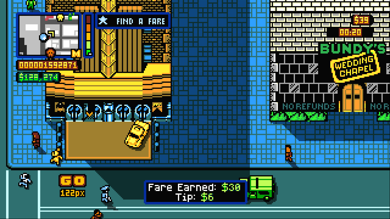 Retro City Rampage is an open-world game inspired by the Grand Theft Auto series that combines driving with fighting and shooting in a retro 8-bit style. Originally started as a homebrew NES demake of Grand Theft Auto III, it was eventually developed into a full game. The game is set in eighties and the protagonist is a mullet-styled gangster who wreaks havoc in Theftropolis city. It draws many elements from the series it was inspired by, such as the ability to hijack any car, fight on foot with melee and ranged weapons, and shake off the law when too many crimes are committed.