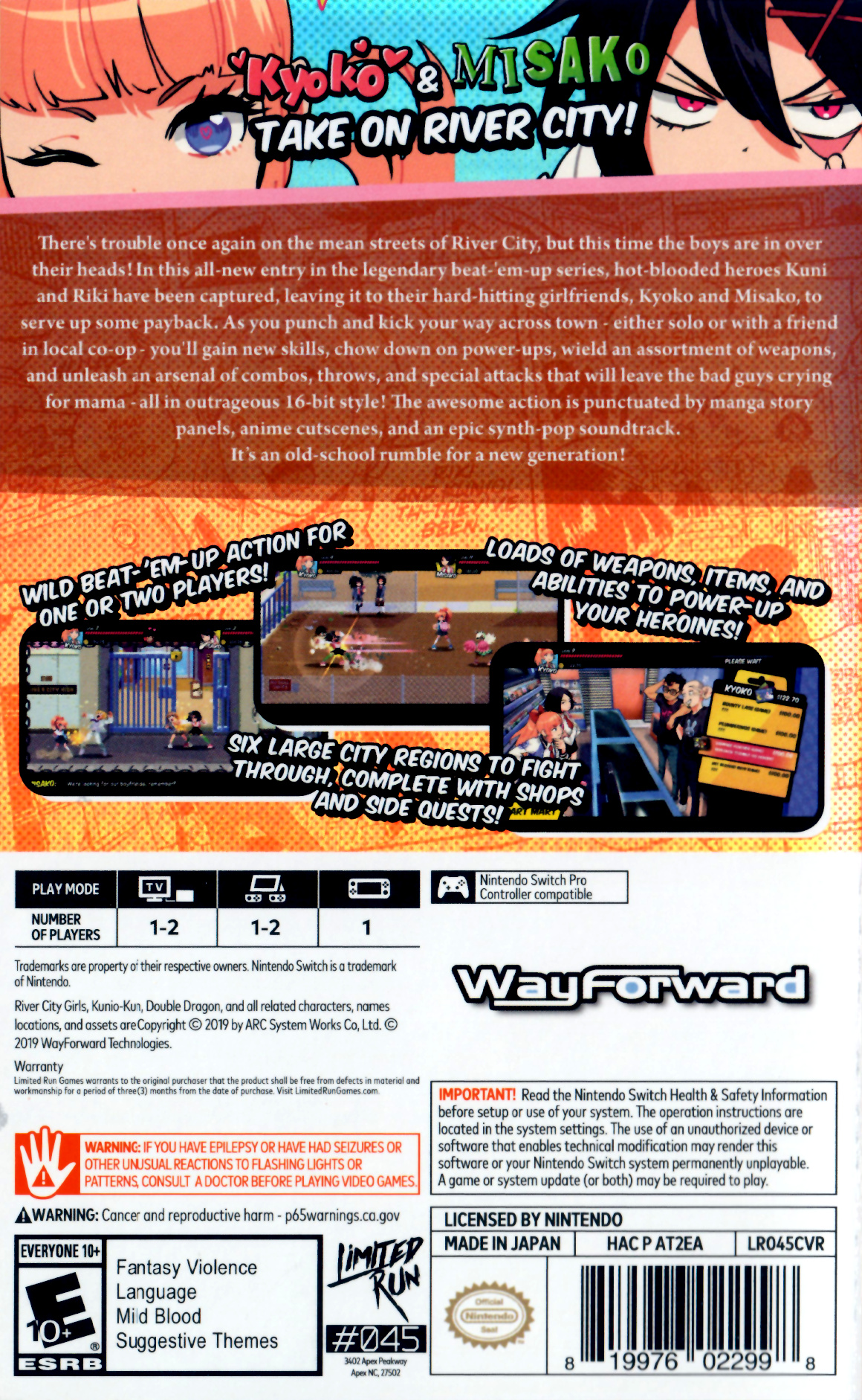 There's trouble once again on the mean streets of River City, but this time the boys are in over their heads! In this all-new entry in the legendary beat-'em-up series, hot-blooded heroes Kuni and Riki have been captured, leaving it to their hard-hitting girlfriends, Kyoko and Misako, to serve up some payback. As you punch and kick your way across town - either solo or with a friend in local co-op - you'll gain new skills, chow down on power-ups, wield an assortment of weapons, and unleash an arsenal of combos, throws, and special attacks that will leave the bad guys crying for mama - all in outrageous 16-bit style! The awesome action is punctuated by manga story panels, anime cutscenes, and an epic synth-pop soundtrack. It’s an old-school rumble for a new generation!