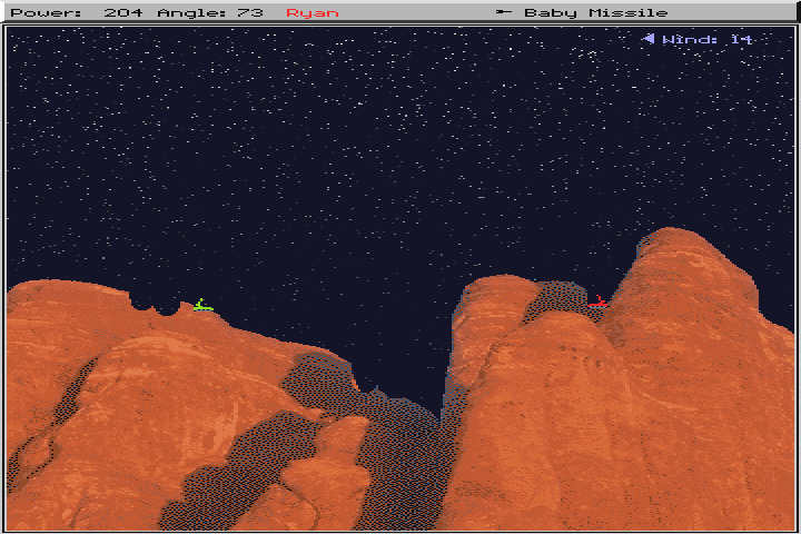 The game offers a variety of weapons. A small sample of these include the standard nukes, which obliterate the screen. There's the Funky Bomb, which scatters smaller bombs in an unpredictable variety of directions. Or, if missiles aren't your thing, you can send your foes a personal gift of flaming napalm. There are also dirt bombs which can be used to bury opponents or yourself, for safety from opposing attacks.