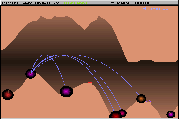 At the start of each round, each player purchases their weaponry, and if they choose, shields and parachutes for defense and safety from long drops. Then it's off to battle! Aim your cannon, taking note of trajectory and wind, and fire off your weapons in attempt to take out the opposition.