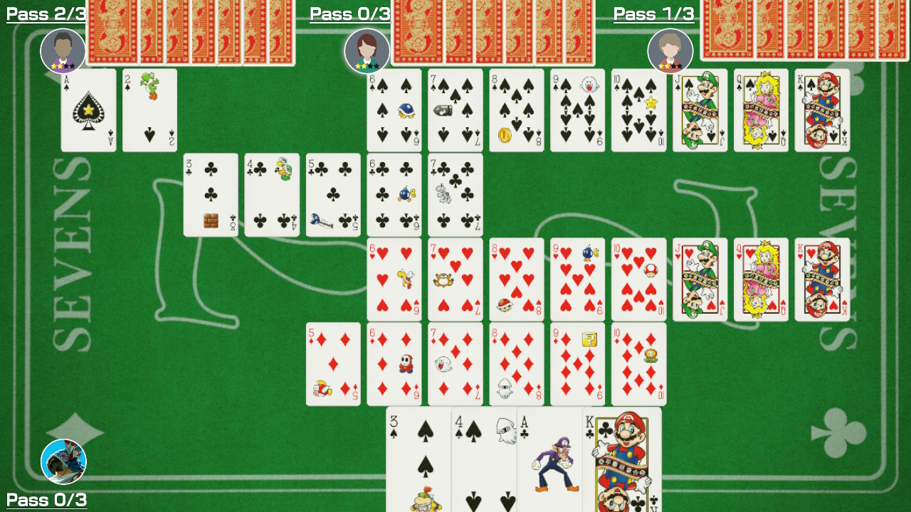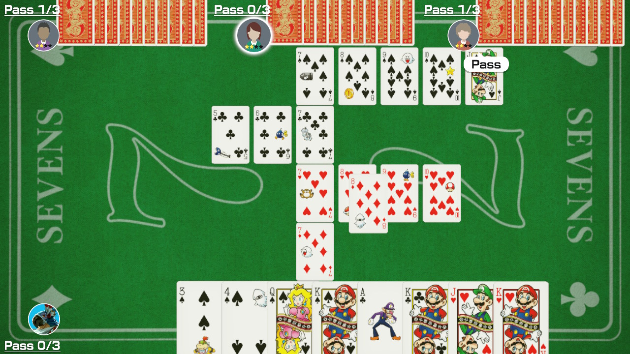 In Sevens, the player with the Seven of Hearts leads off. Play continues as above except that new sequences are started with the remaining three Sevens. It often makes sense for players to avoid playing cards close to Seven in order to force others to play cards in other suits in which the blocking player may hold high or low cards. In some variants of the game all players receive the same number of cards and the remainder (if any) is turned face up and can be played by anyone as needed. In some variants, after a seven has been played other cards of the same suit may not be added before the eight is also played. In some variants players are allowed to pass even when they are able to play a card.