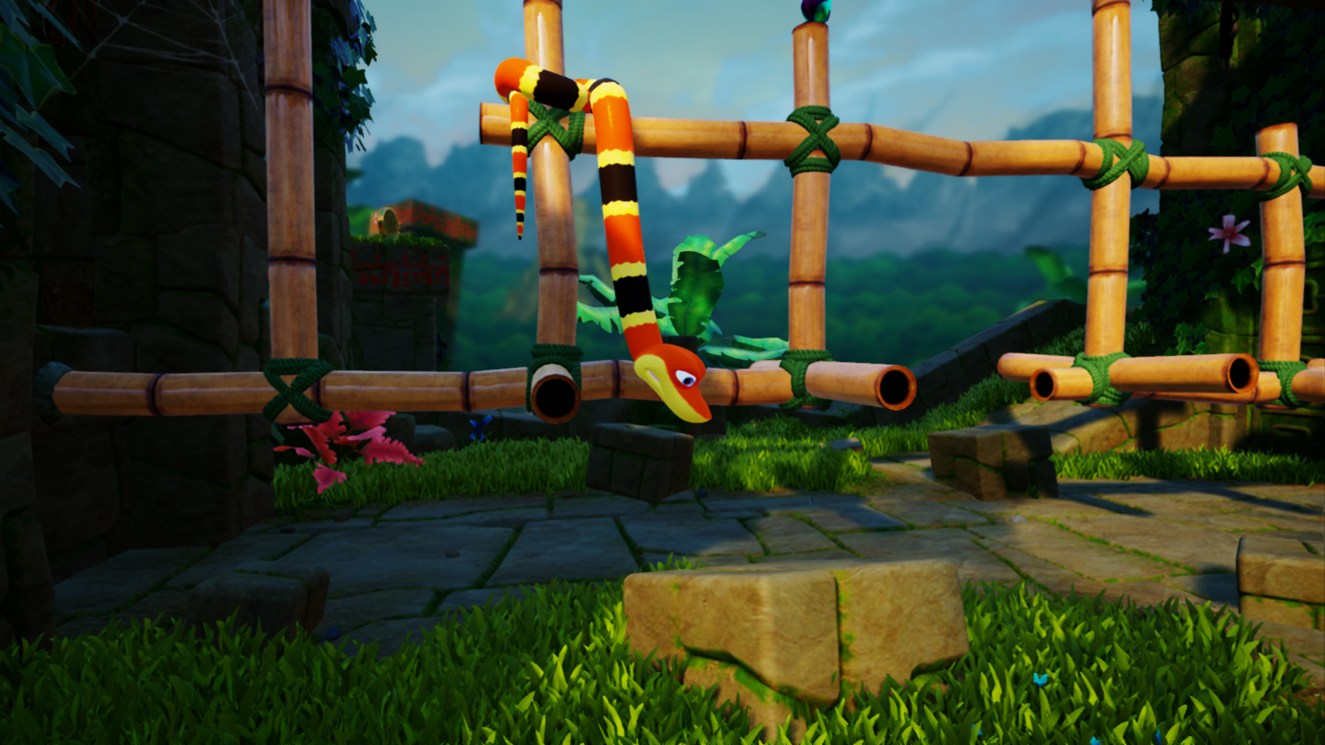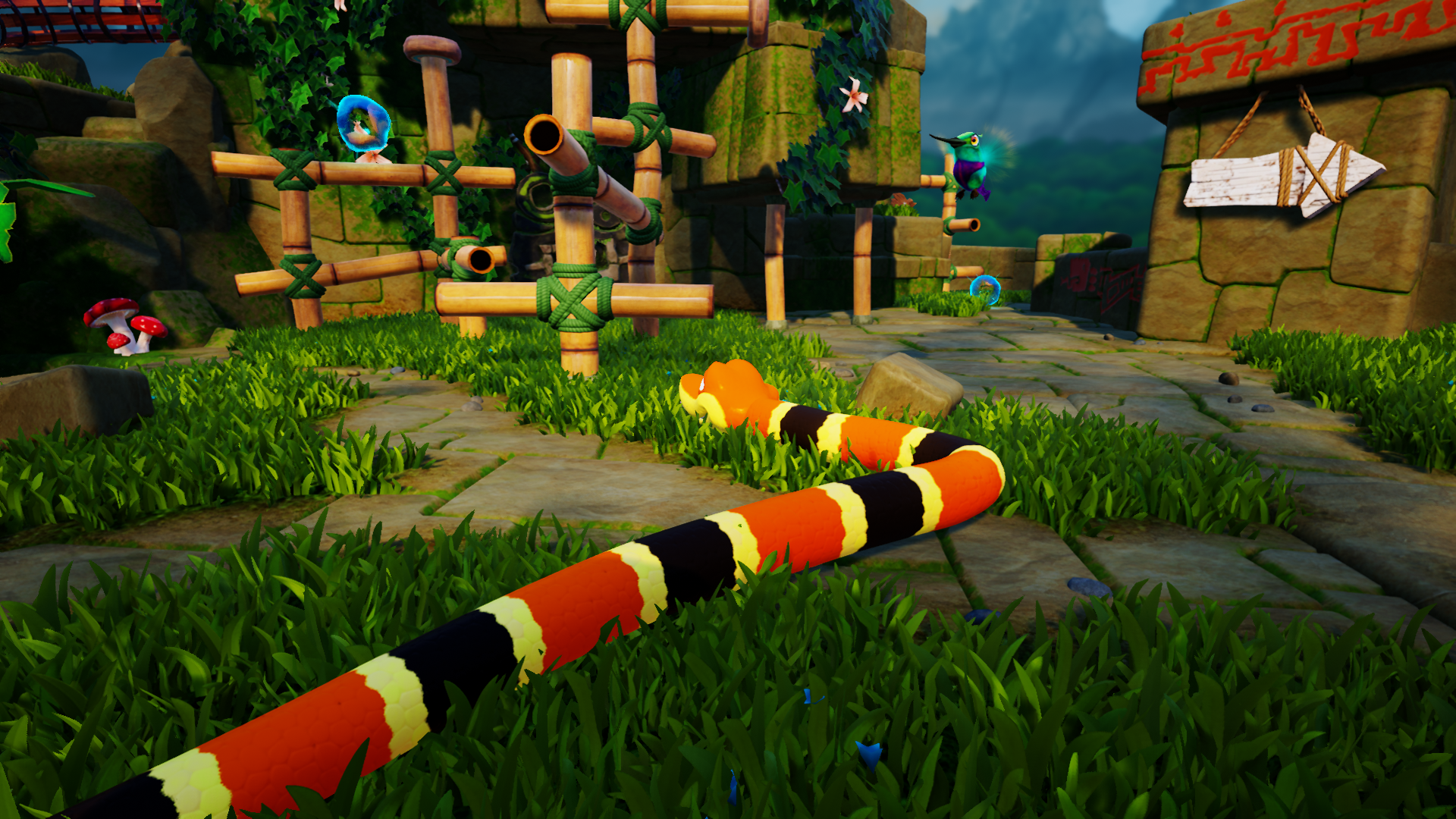 THINK LIKE A SNAKE! When the tranquillity of Haven Tor is interrupted by a mysterious interloper only the unlikeliest of heroes can save the day! Meet Noodle the Snake and his hyperactive best friend, Doodle the Hummingbird, who together must re-unite the missing Keystones with the magical gates that give Haven Tor its mythical power.A unique, physics based puzzle platform game, Snake Pass challenges players to ‘think like a snake’ as they tackle precarious puzzles as only a snake can. Slither through long grass, coil around bamboo and climb out of trouble in the latest game from award winning independent studio Sumo Digital!