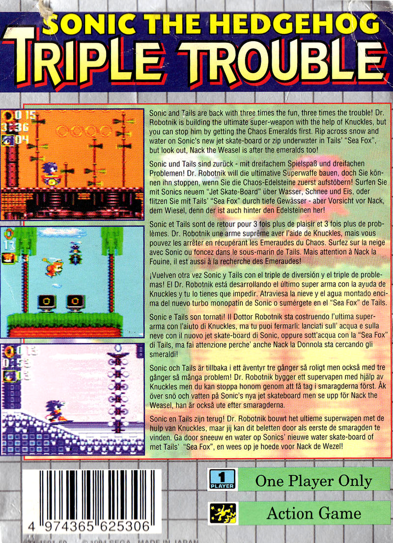 The gameplay is like the other Sonic titles, but this is only available on the Game Gear. The player can choose to play as Sonic or Tails (who can fly), and you're trying to reach the Chaos Emeralds before anyone else. A change from other Sonic games is that when hit, all rings are not lost, only a set amount (30–50 depending on the level) is lost.