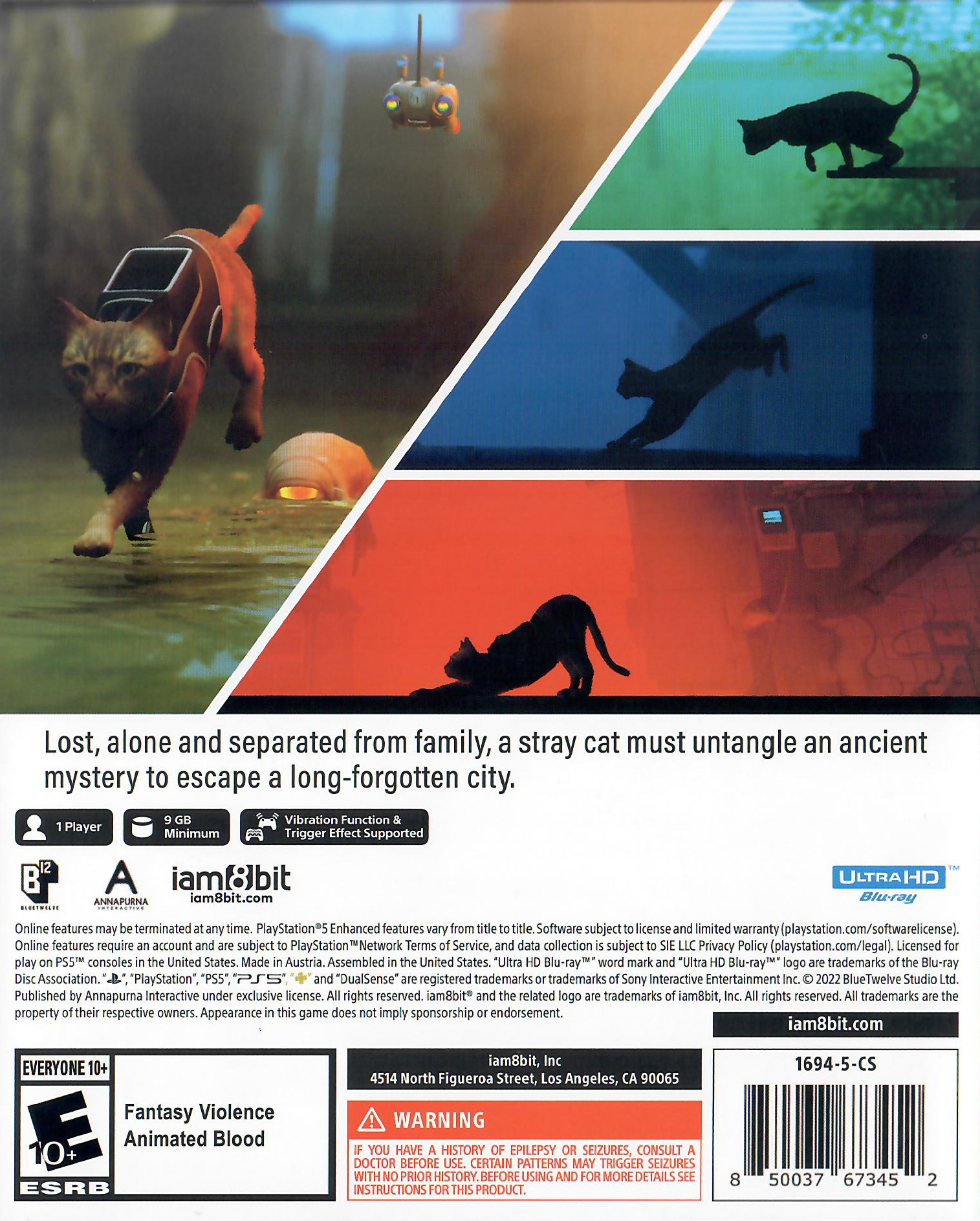 Stray is an action game with puzzle elements following a cat surviving in a neon-lit, decaying cybercity inspired by Kowloon Walled City. One day, the cat is separated from his family and tumbles down deep inside the underbelly of the city. Looking for a way back, it roams the environments and meets the droids left behind, inhabiting the world devoid of the humans who designed them. The game mixes different types of gameplay in a largely linear experience. The cat navigates the environment by jumping on objects to find a way up or through sections. (Optional) prompts appear where it is possible to navigate and these can be strung together in a fluid, parkour-like chain.