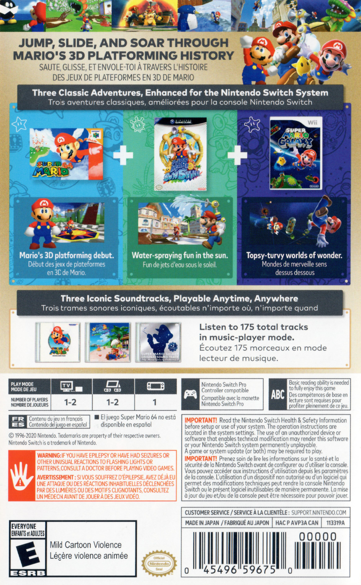 Play three classic games at home or on the go—all in one package on the Nintendo Switch™ system! Jump into paintings in Super Mario 64™, clean up paint-like goop in Super Mario Sunshine™, and fly from planet to planet in Super Mario Galaxy™.