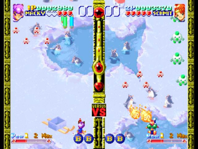 The game plays mostly as a vertically-scrolling shooter, with you controlling your avatar and attempting to shoot and avoid the incoming enemies. The difference in this game is that each player has his own play area, a la Puyo Puyo, and the enemies cause splash damage around themselves when shot. Thus chaining the destruction of several enemies creates a combo that performs an attack move on your opponent. These moves can range from targeted fireballs, to special moves unique to each character, to the summoning of special "boss" characters that the other player must destroy before continuing.