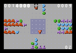 Zoop is a fast-paced puzzle game in which the player eliminates colored shapes that are approaching his alter ego, another colored shape, before they reach the top, somewhat similarly to Tetris.