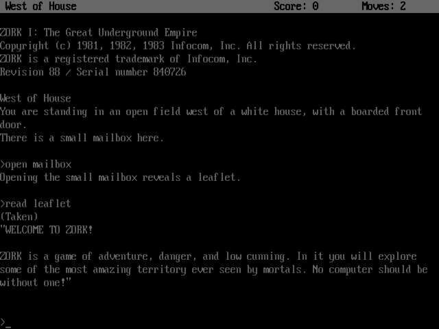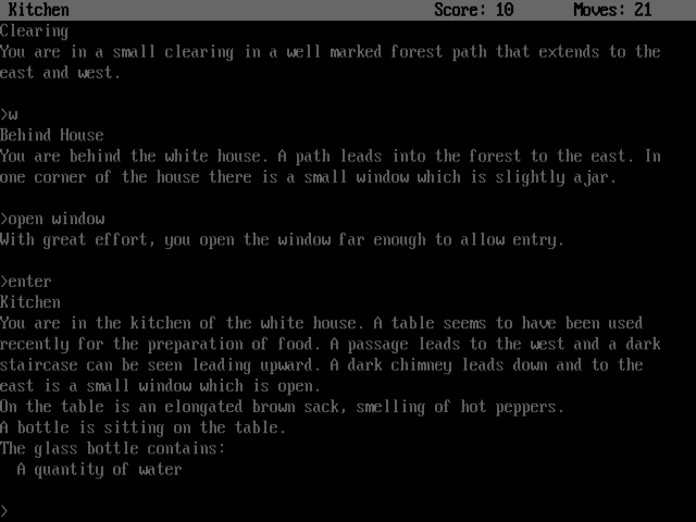Zork: The Great Underground Empire is a classic text adventure game. The player begins as an "adventurer" standing near a white house in a nice forest, but soon descends into the Great Underground Empire, where most of the game takes place. The player's quest is to collect the Nineteen Treasures of Zork.