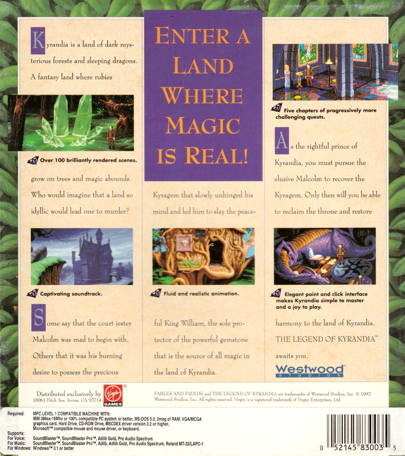 The Legend of Kyrandia is the first in a trilogy of adventure games by Westwood. In this game the player controls Brandon, grandson of Kallak - a wizard of the realm of Kyrandia. Malcolm, a psychotic jester imprisoned in the past by Kallak, has broken free and wishes to take over the land as well as lay down his revenge. He turns Kallak into stone leaving him with only his eyes, so that Kallak is not denied his tears for Kyrandia's sake.