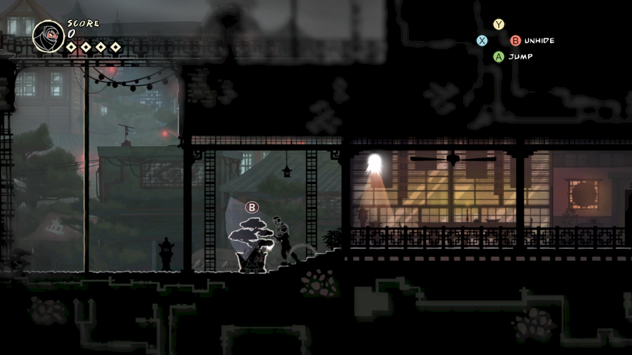 The game features a similar art style to Klei's prior Shank games. The environments feature sources of light that will reveal the player to any guards nearby. Additionally, many of the players actions (like running, breaking objects, etc.) will create noise the guards will hear and respond to. By approaching enemies undetected, the player character is able to execute a one-hit kill. It's also possible to complete the entire game without killing any enemies, with the exception of two named NPC "boss" characters.
