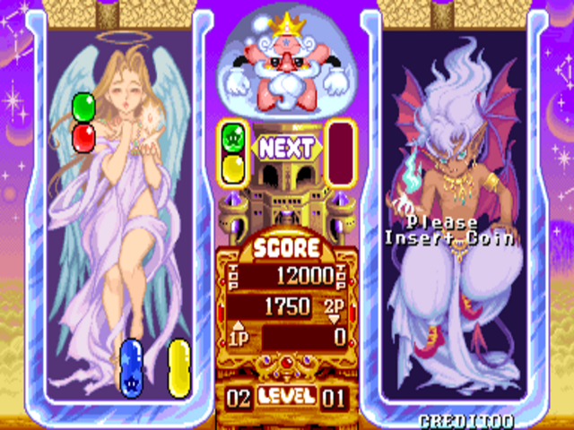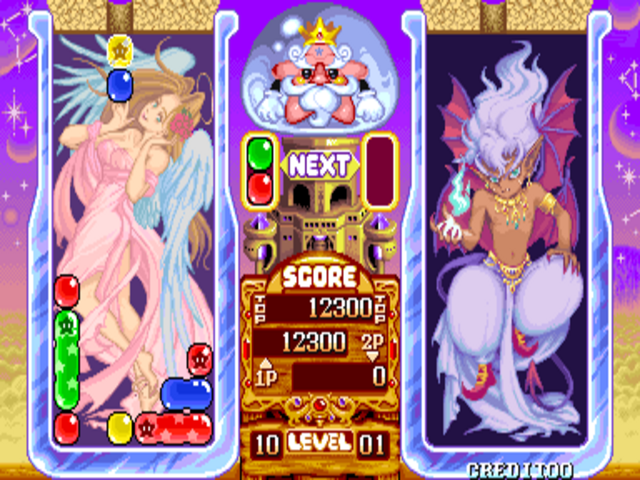 Pnickies is a puzzle game similar to Puyo Puyo, where you stack differently coloured jelly blocks and ideally form chain reactions. The difference to Puyo Puyo is that the blocks do not disappear once a certain number of same coloured ones are connected, but instead there are star blocks which also come in the same colours as the normal blocks. To make blocks disappear the player has to form a connected group of same coloured blocks that contain two star blocks. As soon as the 2nd star block is added the affected group goes away and any blocks that were on top of parts of this group will fall down.