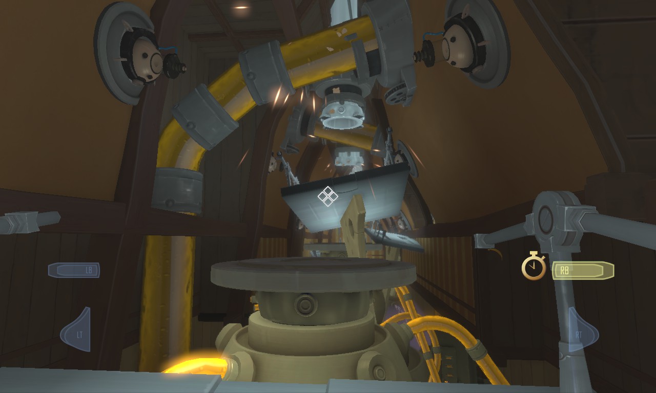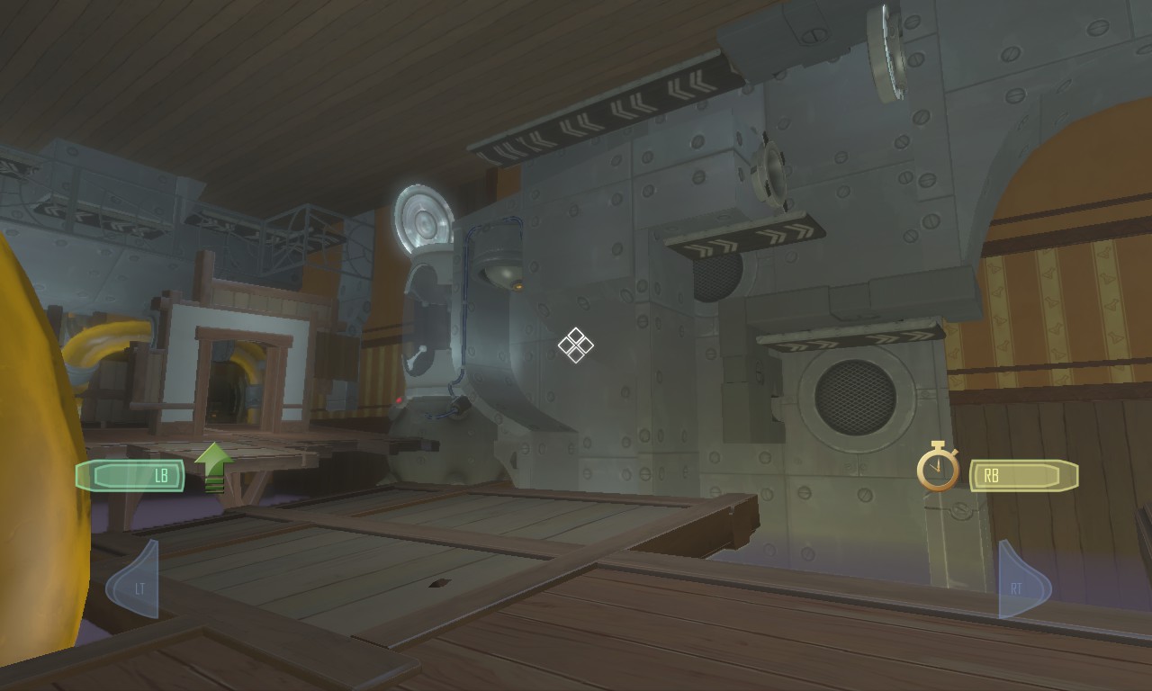The boy is initially only able to walk around, jump, and pick up, drag and throw items. After a while he gets access to the Interdimensional Shift Device (IDS) that allows him to switch between dimensions. In the Fluffy dimension everything becomes lighter and easier to pick up. Heavy is the opposite but the weight can cause objects to break and they can obstruct lasers. Slow makes times ten times slower than usual and Reverse Gravity reverses the gravity for the environment. The boy is unaffected, regardless of the chosen dimension. Some rooms have a dimension triggered automatically, while in others capsules needs to be gathered first to be able to shift between dimensions. In later parts a quick shift between dimensions is required to solve puzzles. For instance, an object can be picked up and thrown in the Fluffy dimension, and while it is still in the air a switch to Heavy can cause it to break through a surface. Using Slow in that situation allows the boy to throw an object and then jump on top to ride along. Many puzzles also focus on precise platform jumping.