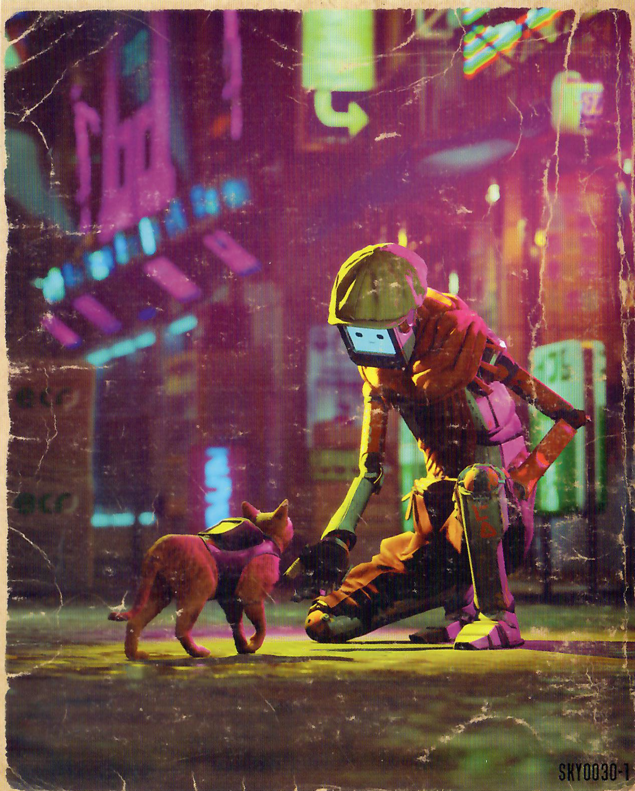 Stray is an action game with puzzle elements following a cat surviving in a neon-lit, decaying cybercity inspired by Kowloon Walled City. One day, the cat is separated from his family and tumbles down deep inside the underbelly of the city. Looking for a way back, it roams the environments and meets the droids left behind, inhabiting the world devoid of the humans who designed them. The game mixes different types of gameplay in a largely linear experience. The cat navigates the environment by jumping on objects to find a way up or through sections. (Optional) prompts appear where it is possible to navigate and these can be strung together in a fluid, parkour-like chain.