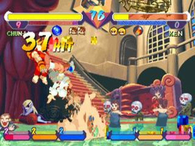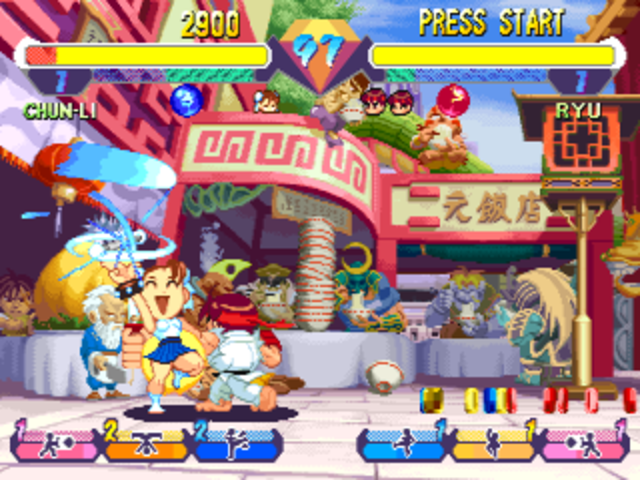A 1-on-1 versus fighting game in the Street Fighter mold with a cast of "super deformed" fighters taken from several of Capcom's fighting game series. Ryu, Ken, Chun Li, Zangief and Akuma are featured from Street Fighter II, Sakura and Dan from Street Fighter Alpha. Ibuki is from Street Fighter III. Hsein-Ko, Morrigan and Felicia are featured from DarkStalkers. It also includes the character Tessa from Warzard.