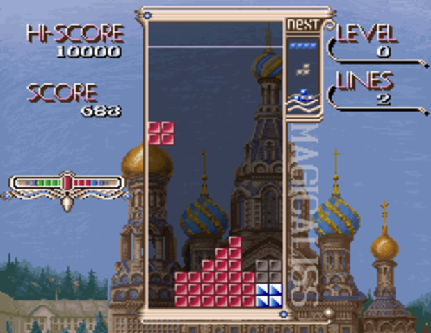 The most unique mode is Magicaliss, which has never shown up on any other version of Tetris. In Magicaliss, pieces come in three basic colors, and by rotating the piece, the player can choose between them. Creating a line entirely out of one color will clear all blocks on the screen of that color. There are also grey pieces, which can only be cleared by creating a line made entirely from one color, which will cause all grey blocks on screen to become that color. There are also rare rainbow pieces which will act as any color. Besides these additions, the game itself is basic Tetris.