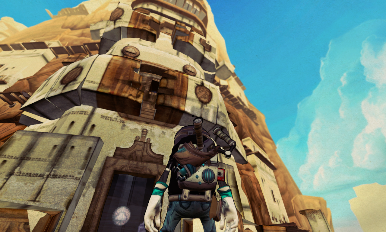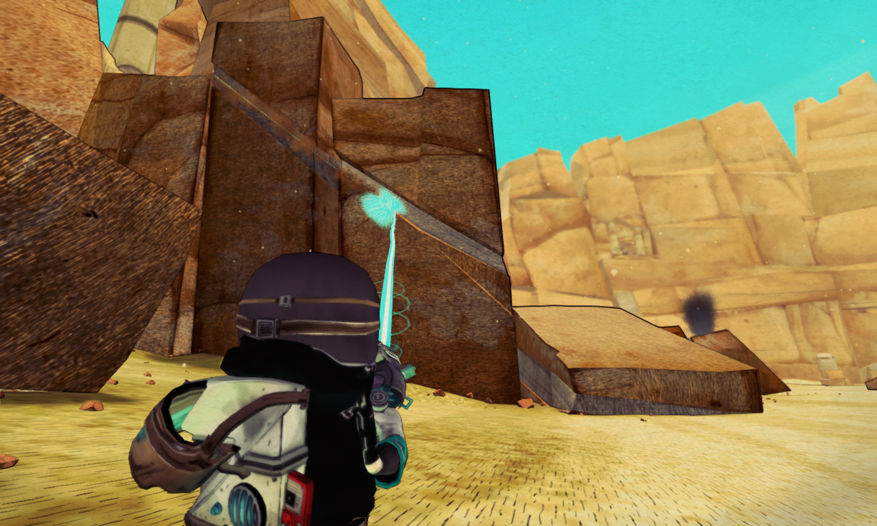 After the initial level where the mechanics are introduced, Tiny receives hints over the radio from his taxi robot. The game's art style has a comic book look with cel-shaded edges and visual sound words. Despite the sandbox possibilities most of the levels are set along a linear path, but with different options to approach the situation. The game's soundtrack is provided through fifteen tapes that are found throughout the game. Each tape provides an additional song and the player can cycle between them using a tape recorder. The general path is shown through collectible rocks and the game contains achievements.