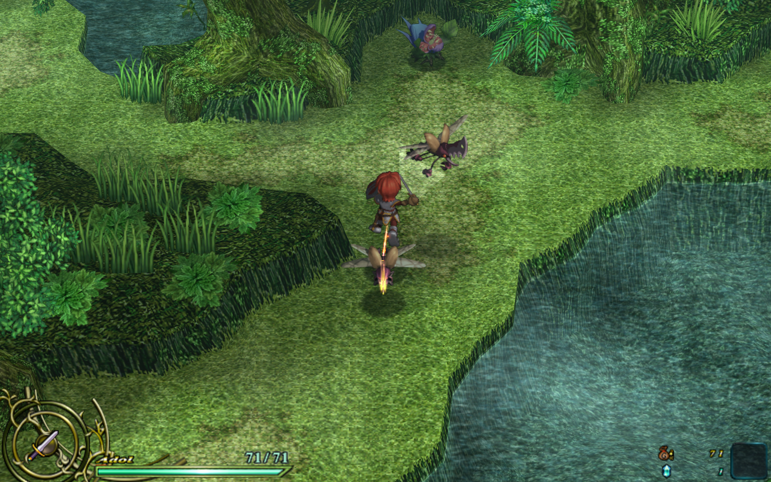 The Ark of Napishtim is an action role-playing game set (for the first time in the series) in a fully 3D environment. The game world is seamless, with transitional overworld areas connecting dungeons and settlements. Much of the game takes place in hostile areas, where the protagonist engages in fast-paced action combat against regular enemies and bosses. Like its immediate predecessor, the game abandons the "bumping" combat style of the earlier installments, opting instead for the more common active combat. Adol can execute regular attacks and jump, as well as combine those for upward and downward slashes, dash attacks, and longer jumps. Experience points and money are awarded for defeating enemies, and leveling up is fully automatized. Armor and accessories can be found in treasure chests or purchased.